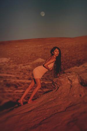 Beautiful, primal woman in the nature of desert with the moon emerging