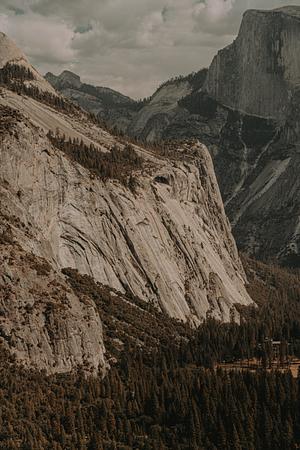 Yosemite park in California. A beautiful vertical capture with stunning clouds overhead in a vintage film aesthetic.