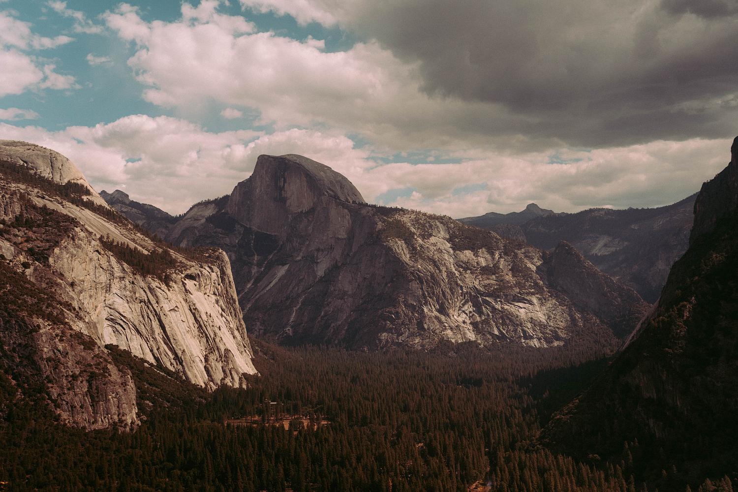 Yosemite park in California. A beautiful wide capture with stunning clouds overhead in a vintage film aesthetic. Inhale.